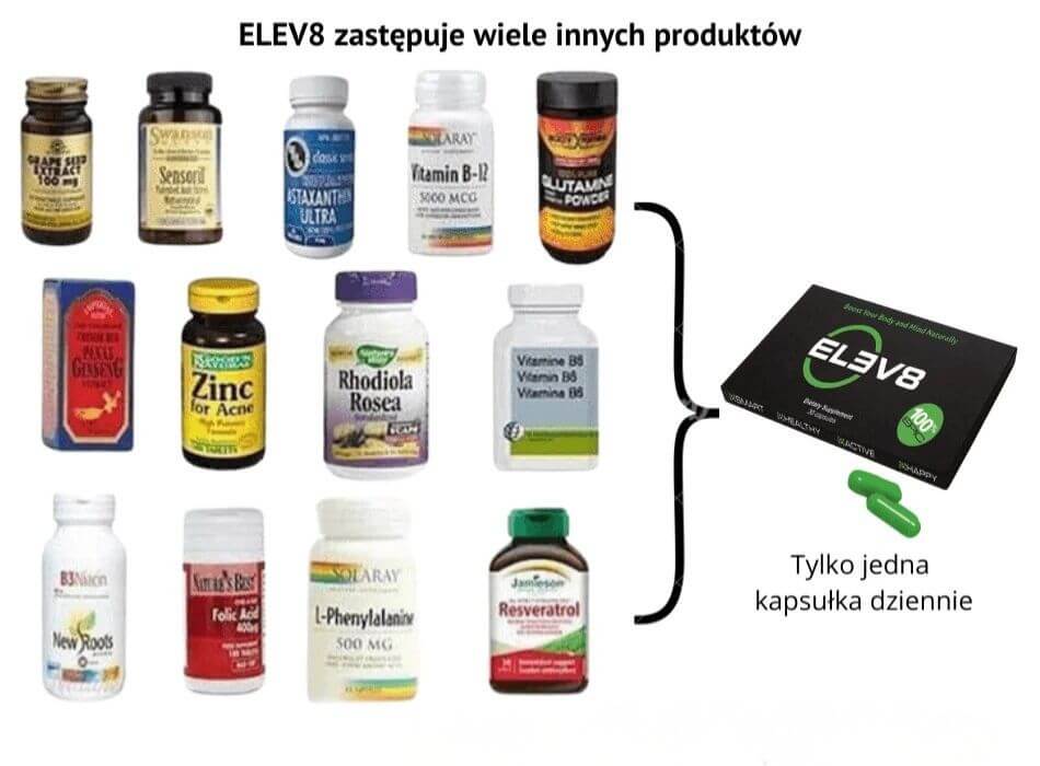 Na rynku suplementów, większość produktów zawiera w składzie syntetyczne witaminy, lub pojedyńcze składniki. Elev8 wyróżnia się tym, że w jednej kapsułce zostało połączonych 25 najlepszych ekstraktów roślinnych, a także witaminy i minerały pochodzące z naturalnych źródeł. Każda kapsułka dostarcza skoncentrowaną dawkę fitoskładników – ilość porównywalną z około 4,5 porcjami świeżych warzyw i owoców.