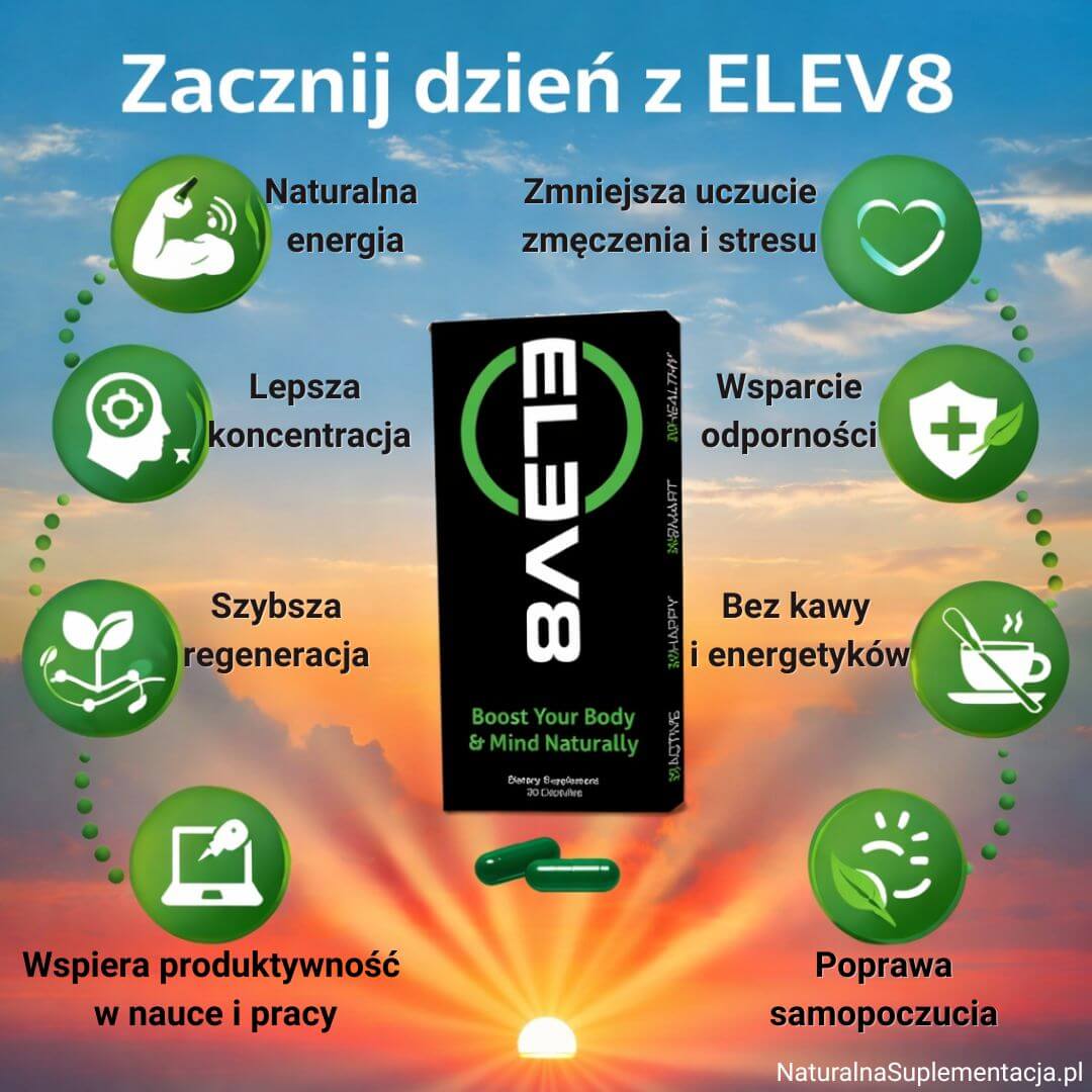 Elev8 nie jest lekiem i niczego nie leczy, ale dostarcza komórkom cennych składników roślinnych, witamin i minerałów, które wspierają ich naturalne funkcje. Dzięki temu organizm staje się silniejszy, sprawniej się regeneruje i lepiej radzi sobie z różnymi wyzwaniami.